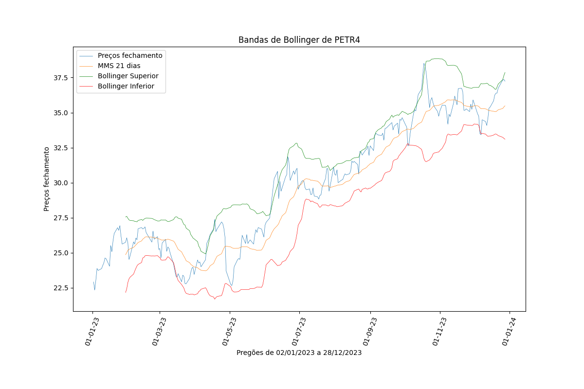 São apresentados os gráficos com os preços de fechamento com as linhas de média móvel de 21 dias (MM21) e as bandas de bollinger, indicando pontos de suporte e resistência.