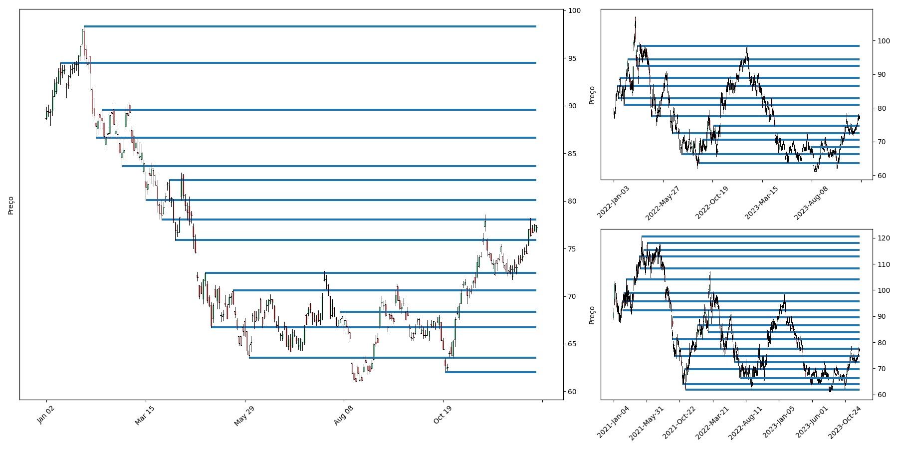 Gráficos de velas (candles) com traços de suporte e resitência - de 12, 24 e 36 meses - permitem fácil visualização da evolução dos preços dos papéis ao longo do tempo.